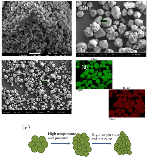 SEM image of (a) massive αMnS-6, (b) massive αMnS-10, (c) massive αMnS-14, (d) mapping images of MnS, and (e) process of αMnS bulk crystals change.