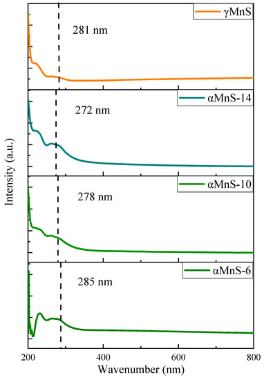 UV absorption spectra of αMnS-6, αMnS-10, and αMnS-14.