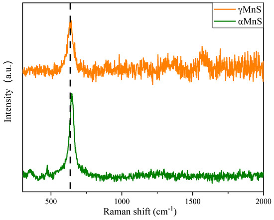 Figure 4 showed Raman spectra of MnS with different crystal forms. αMnS exhibited Raman absorption peak at 636 cm−1. However, Raman absorption peak γMnS was at 646 cm−1. There was a little difference between peak of αMnS and that of γMnS. The reason for difference might be that Raman absorption peak shift should be affected by lattice constant of distortion.