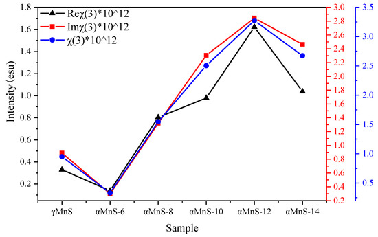 The third-order susceptibility of nanoparticles was also calculated in our previous studies, but there was no discussion on various sizes and mechanisms of NLO property of nanoparticles [18,23]. According to equations, increase of α and Leff resulted in NLO absorption coefficient β enhanced. ΔTp-v would influence change of n2 and ultimately affected final trend NLO susceptibility χ(3). T could be observed from Figure 5a,b that T = 0.86 and T = 0.83. And ∆Tp-v also could be obtained by Figure 5a,b that ∆Tp-v,αMnS-6 = 0.29 and ∆Tp-v,γMnS = 0.3. β could be calculated by the equations that βαMnS-6 = 1.78 × 10−11mW−1 and βγMnS = 2.14 × 10−11mW−1. And n2 could be obtained by equations that n2,αMnS-6 = 2.17 × 10−12 esu and n2,γMnS = 2.48 × 10−12 esu. Reχ(3), Imχ(3), and χ(3) are displayed in Figure 6. Susceptibility χ(3) of γMnS was 0.95 × 10−12 esu and χ(3) of αMnS was 0.33 × 10−12 esu. Due to different crystal forms, αMnS and γMnS nanoparticles exhibited different NLO response.