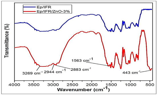 The FTIR spectra were used to investigate bonding interactions as well as identifying functional groups in different formulation samples. The FTIR spectra of the Ep/IFR and Ep/IFR/ZnO-3% samples are shown in Figure 8. An absorption band at 443 cm−1 was observed in the Ep/IFR/ZnO-3% sample only. It was clearly indicated that ZnO was contained in this sample. In both samples, reaming bands (3269, 2944, 3883, and 1563 cm−1) were observed. The samples containing the groups OH, N–H, C–H, and C=O were based on these bands.