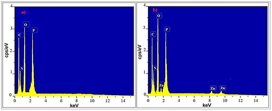 The EDS spectra of the Ep/IFR and Ep/IFR/ZnO-3% formulations are shown in Figure 9. There are four significant peaks corresponding to carbon, nitrogen, oxygen, and phosphorus, respectively, according to the EDS spectra in Figure 9a. These results were compatible with the composition of the F0 formulation used for APP, the epoxy, and the CFA. There are five significant peaks corresponding to carbon, nitrogen, oxygen, phosphorus and zinc, respectively, in Figure 9b. These results were compatible with the composition of the F3 formulation used for ZnO NPs, APP, the epoxy, and the CFA. These results are in good agreement with previously reported results.
