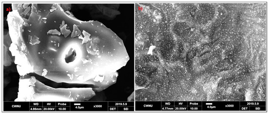 To know the relationship between the flame retardancy of coatings and the microstructures of intumescent chars, the char residues of Ep/IFR and Ep/IFR/ZnO-3% after cone calorimeter tests were imaged by SEM with a 3000 magnification. The SEM images of the charred layers of Ep/IFR and Ep/IFR/ZnO-3% are clearly shown in Figure 12. From Figure 12a, it is seen that the Ep/IFR char had more cracks with big holes, which explained the crumbliness and the fragility of the char residues. Figure 12b shows that the surface of the char residues of Ep/IFR/ZnO-3% was smoother, more homogenous and more compact than that of the Ep/IFR char. The holes and the cracks, which were formed in the Ep/IFR char, may be due to the release and the flow of volatile gases into a flame zone. The addition of ZnO can form cross-links with the IFR system. As a result, a compact and strengthened char was formed, which effectively prevented the flow of gases from the material to the flame zone. Therefore, there were no holes and cracks in the Ep/IFR/ZnO-3% char residue. These results concluded that the addition of ZnO at an optimum level can strengthen chars to increase the flame retardancy of coatings.