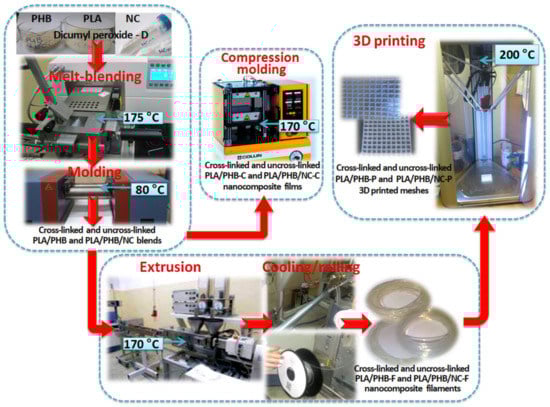 Schematic representation of PLA/PHB blends and nanocomposites preparation and processing of films, filaments, and 3D-printed meshes.
