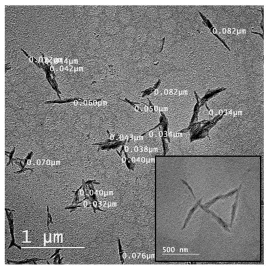 A Tecnai G2 F20 Twin Cryo-Tem transmission electron microscope (TEM) (FEI, Hillsboro, OR, USA), operating at 120 kV, was used to observe the morphological features of cellulose nanocrystals. Cellulose nanocrystals were examined directly, without staining for contrast enhancement. One droplet of NC suspension was deposited on carbon-coated copper grids and allowed to dry at 25 °C before observations.