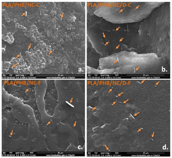 SEM images of the fractured surface of PLA/PHB-based nanocomposites filaments showed a distinct morphology when compared to that of the films due to the orientation effect in the extrusion process (Figure 3c,d). Usually, the alignment of the crystalline structure in the polymers is parallel to the extrusion direction resulting in a different structure compared to that obtained by compression []. Reprocessing of composites by extrusion contributed to an advanced blending of components thus resulting in a more homogenous material. As seen in Figure 3c, the fracture surface of PLA/PHB/NC-F composite filament appears rougher, flake-like morphology and the fractures were developed in different directions indicating a ductile fracture. The fracture surface of the cross-linked PLA/PHB/NC/D-F sample exhibited, as in the case of the films, a more homogenous structure and a better dispersion and adhesion of NC (Figure 3d, arrows), because of the positive effect of cross-linking agent. The NC fibers are well embedded in the PLA/PHB matrix. These observations highlight the positive effect of DCP in enhancing interfacial adhesion between NC and PLA/PHB matrix and simultaneously in improving the compatibility between PLA and PHB. Both cross-linked and uncross-linked PLA/PHB/NC-F filaments displayed plastic deformation during fracture and different fracture directions which require more energy at break, therefore, the filaments should induce increased toughness.