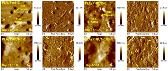 After adding the DCP, the morphology of PLA/PHB blends has been changed (Figure 4b). The cross-linking agent reduced the size of PHB domains and the separation between the phases becomes gradual, resulting in better dispersion of PHB domains in PLA. Moreover, due to the DCP, the surface of PLA/PHB/D-C sample became rougher, RMSR increasing from 12 to 22 nm. This shows that PHB attached to PLA during reactive cross-linking and caused an increase of RMSR as compared with the uncross-linked PLA/PHB. The subsequent addition of NC in the PLA/PHB matrix resulted in a higher roughness (RMSR 32 nm). The freeze-dried NCs (marked with yellow arrows) are randomly distributed on the film surface (Figure 4c, Peak Force Error image). The PLA/PHB/NC/D-C cross-linked nanocomposite exhibited a more homogenous dispersion of NC in the PLA/PHB matrix, many individual NCs being visible at the surface of the sample (yellow arrows, Figure 4d, Peak Force Error image). NC fibers appeared covered with a polymer layer suggesting that the simultaneous addition of NC and DCP enhanced the interfacial adhesion and influenced the compatibility between PLA and PHB matrices and, possibly, their crystallinity. This nanocomposite showed the highest RMSR value of 65 nm. The AFM results sustained the previously SEM observations concerning the effect of DCP in increasing the compatibility between the two polymers and the dispersion of cellulose nanocrystals.