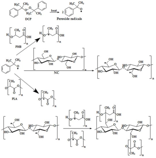 The general mechanism of peroxide radical initiated grafting of PLA or PHB onto cellulose comprises in the first step generation of the peroxide radicals followed by the formation of PLA/PHB radicals due to the preferentially attack on the tertiary carbon atoms, or in the case of cellulose, on the C6 position of the glucopyranose ring (Figure 6). In the propagation and termination steps, PLA/PHB and cellulose radicals react to each other, a demonstrated route through Electron Spin Resonance (ESR) measurements by other authors [,].