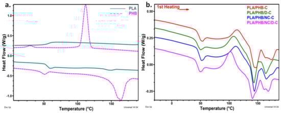DSC curves of pristine PLA and PHB—first heating and cooling scans (a) and that of PLA/PHB blends and nanocomposites—first heating scan (b).