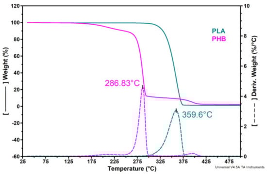 Thermogravimetric curves (TG) and their derivatives (DTG) for PLA and PHB.
