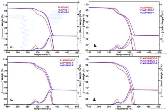 All PLA/PHB blends and nanocomposites exhibited a two-step degradation profile regardless of the processing method (Figure 9a–d). PLA is more thermally stable than PHB and the blending of these two polymers resulted in an intermediary behavior, the Ton of PLA75/PHB25 being located between those of individual polymers (Figure 9). This may be due to the hydrolysis reaction which is catalyzed by the carboxyl end groups of polyester resulted after thermal degradation [].