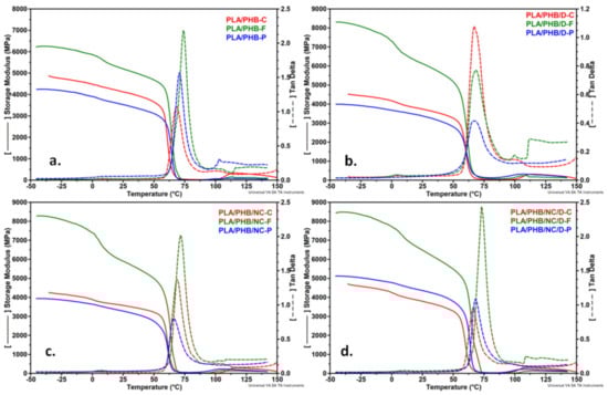 PHB/PLA blends and nanocomposites exhibit two glass transitions (Figure 7b) because PLA and PHB are not miscible. However, the Tg values are closer compared to that of pristine polymers (Table 2) suggesting compatibility between PLA and PHB. The smallest difference, of only 29 °C, between the Tg values of PLA and PHB, instead of 67 °C in the case of pristine polymers, was noticed for PLA/PHB/NC (Table 2). This shows the influence of NC in increasing the compatibility between PLA and PHB. Arrieta et al. [] also studied PLA/PHB/NC nanocomposites and observed no TgPLA shift to lower temperature or compatibilising effect of NC. To the best of our knowledge this compatibilizing effect of nanocellulose in the PLA/PHB blend was experienced for the first time. It is worth mentioning that TgPHB shift was more important (17–20 °C) in uncross-linked samples—the addition of DCP decreased TgPLA with 10–12 °C, which may be caused by a compatibilising effect or a reduction of the molecular weight of PLA due to the chain scissions induced by DCP [].