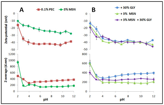 Effect of different pHs on the Zeta potential and Z-average size of 0.1% PEC-based and 3% MSN water solution (Panel A), and of 0.1% PEC-based FFS (prepared in the presence of 30% GLY (w/w with PEC) or 3% MSNs (w/w with PEC) or in the presence of both 3% MSNs and 30% GLY (Panel B).