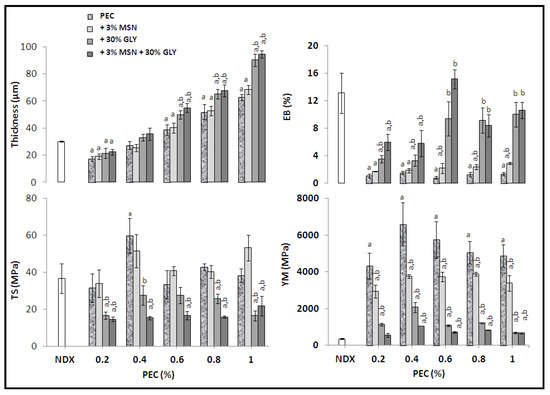 Figure 2 reports the film thickness and mechanical properties of PEC-based films prepared with different concentrations of PEC (0.2%, 0.4%, 0.6%, 0.8% and 1%) either in the presence or absence of 3% MSNs or 30% GLY and in the presence of both. The results were compared with the Viscofan NDX edible film that is a commercially available material prepared from collagen and mainly used in the meat industry [54].