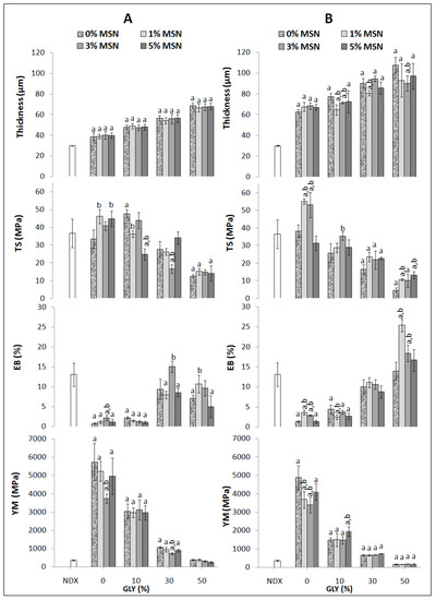 For further studying the influence of both MSNs and GLY on film thickness and mechanical properties, 0.6% and 1% PEC-based films were chosen. Figure 3 shows that, in both kinds of films, thickness increases significantly by increasing the GLY concentrations, using 10%, 30%, or 50% of the plasticizer, respectively. No effect was observed on the 0.6% PEC film thickness by changing the MSN concentrations. Regarding 1% PEC films, the thickness was significantly reduced when the films were prepared in the presence of 10% GLY with both 1% and 3% MSNs. Thickness of films made in the presence of 30% GLY was affected only with 1% MSNs, while thickness of films made in the presence of 50% GLY was affected when 3% MSNs were added. Moreover, the presence of either 1% or 3% MSNs in FFS containing 50% GLY provokes an increased EB compared to the NDX material and to all other film kinds. However, 50% GLY-containing films showed lower TS and YM among all the studied films.