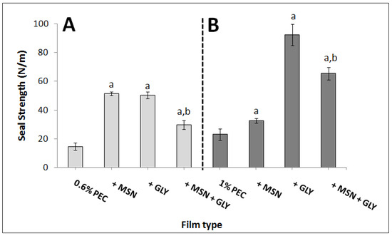 Seal strength of 0.6% PEC film prepared with or without 3% MSNs (w/w PEC), 30% GLY (w/w PEC) or in the presence of both (Panel A) and 1% PEC film prepared with or without 1% MSN (w/w PEC), 50% GLY (w/w PEC) or in the presence of both (Panel B). All the films were prepared at pH 7.5. The values significantly different from those obtained by PEC only (0.6% or 1%) are indicated by “a”, while the values indicated by “b” were significantly different from those obtained by only adding GLY (p < 0.05).