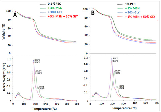 Figure 5 shows the TGA and differential thermal gravimetry (DTG) curves of 0.6% (Panel A) and 1% (Panel B) PEC films prepared with MSNs or GLY or with both. The weight loss curves of all samples exhibited a first weight loss appearing from room temperature to about 110 °C, representing evaporation of water molecules, present mainly as free water [59].