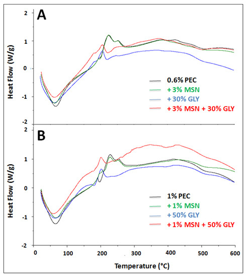 For all the films this weight loss is about 15%–17%. After this, a second and more significant mass fall appears, corresponding to the degradation of the organic films. In particular, for films containing only PEC, degradation started at about 200 °C for both concentrations of the FFS (0.6% and 1%), having a residue of 30% approximately at 400 °C. In contrast with the first step, the second process represents an exothermic transition, as it can be observed in Figure 6. This behavior agrees with previous works [60,61]. As it can be observed in both Panels of Figure 5, the presence of GLY in the films reduces the thermal stability, starting the degradation of the films (at around 170 °C), no matter the presence, or absence of MSNs. An additional sample weight loss was observed at the range of 260–400 °C in PEC film prepared with or without MSNs. In this case, due to the fact that a little difference percentage is observed, the weight loss could be related to the decomposition and pyrolytic de-polymerization of the PEC [62,63]. In films made of either 0.6% or 1.0% of PEC, the presence of MSNs results in a small increment of the residual mass, which can be justified according to the high stability of this inorganic nanomaterial [64].