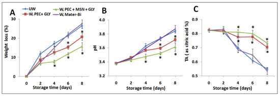 Effect of wrapping with pectin films on weight loss % (A), pH (B), and titratable acidity (C) of strawberries stored for several days (0–8 days). * indicates statistically significant differences at p < 0.05 compared to the unwrapping group (UW) used as a control, and to samples wrapped with Mater-Bi®.