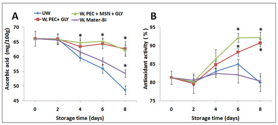 Effect of wrapping with pectin films on ascorbic acid content (A), and antioxidant activity (B) of strawberries stored for several days (0–8 days). * indicates statistically significant differences at p < 0.05 compared to the unwrapping group (UW) used as a control and to samples wrapped with Mater-Bi®.