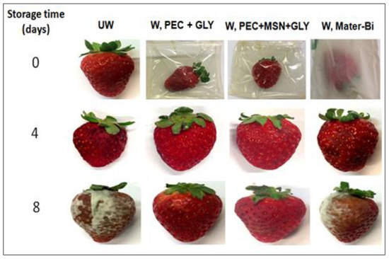 This means that wrapping is not necessary up to four days to have fresh strawberries. However, results after eight days clearly showed that, while both unwrapped and Mater-Bi®-wrapped samples appeared spoiled (Figure 9), the PEC-based wrapping films positively influence the fruit quality. It is interesting to note that W, Mater-Bi samples showed a hardness significantly lower that the UW strawberries, meaning that the fruits were more susceptible to spoiling. These results are consistent with the fact that Mater-Bi® provides a higher barrier to CO2 (Table 1), a gas that influences ethylene production inside the wrapping film, thus promoting ripening [72].