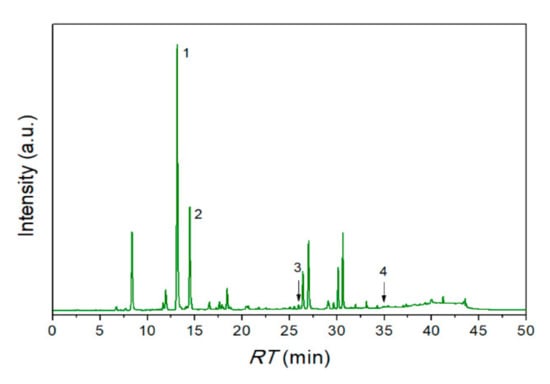 Chromatogram of SE extract at 326 nm: 1–Chlorogenic acid: RT = 13.160 ± 0.002 min; c = 14.389 ± 0.018 mg/g extract; 2–Caffeic acid: RT = 14.500 ± 0.004 min; c = 2.997 ± 0.004 mg/g extract; 3–Rutin: RT = 25.970 ± 0.002; c = 0.564 ± 0.001 mg/g extract; 4–Quercetin: RT = 34.952 ± 0.002, c = 0.073 ± 0.001 mg/g extract.