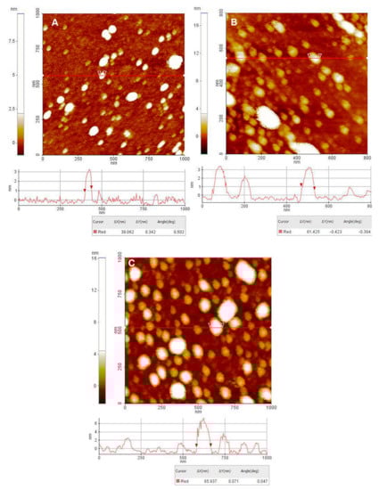 The AFM investigation of SE-loaded samples revealed randomly distributed quasi-spherical particles for all type of lipid vesicles, with size of tens of nm (selected vesicles having the average diameter of 39 nm in the case of liposomes (Figure 2A), 62 nm for transfersomes (Figure 2B) and 86 nm for ethosomes (Figure 2C)). Larger and more homogeneously distributed lipid vesicles are noticed for SE@E sample (Figure 2C), while smaller and more compacted for SE@L sample (Figure 2A). The vesicular nature of samples is confirmed by their spiky (noisy-like) profile (see for examples the lines below Figure 2B,C).