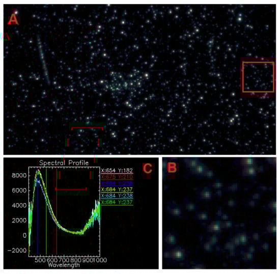 Image recorded by enhanced dark-field microscopy using Cytoviva (A); magnification of marked area from figure A corrected with the lamp spectrum (B) and spectra collected in the isolated points (C).