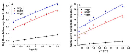 Polyphenols release profiles from SE extract-loaded lipid vesicles fitted with the Korsmayer-Peppas (A) and Higuchi (B) models.