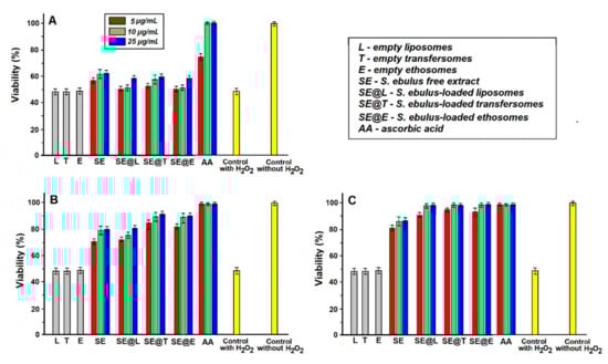 The viability of L-929 mouse fibroblast cells was evaluated after 4 h exposure at different concentrations of hydrogen peroxide aqueous solution in the range of 1–100 mM, its cytotoxicity being dose-dependent. The IC50 concentration of H2O2 was 50 mM. Hydrogen peroxide is not very reactive, but sometimes it can be toxic because it produces hydroxyl radicals []. Adding hydrogen peroxide solution to L-929 cells caused a significant increase in reactive oxygen species (ROS) level, which probably caused the death of L-929 cells. Three concentrations (5, 10, 25 μg/mL) for SE extract and SE-loaded lipid vesicles were selected, which are non-toxic and could prevent H2O2-induced cytotoxicity. Hence, L-929 fibroblast cells were pre-treated with free SE extract and SE-loaded lipid vesicles before adding hydrogen peroxide solution with IC50 concentration. One can notice enhanced viability when cells were previously treated with free and loaded SE extract (Figure 6), which suggested a cytoprotective effect against ROS of all free and loaded SE extract into lipid vesicles.