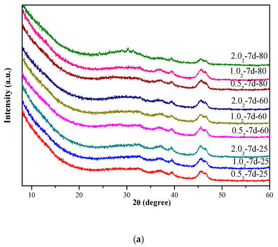 (1) XRD results demonstrated the presence of amorphous K-A-S-H gel and two crystalline products of zeolite K-H and K-G zeolite. The high K2O/SiO2 ratios led to the formation of K-G zeolite, while zeolite K-H in low ratios. For all samples cured at temperatures below 80 °C, the K-A-S-H products were completely amorphous. With increased curing temperature and time, the K-A-S-H products transformed from amorphous form to crystalline zeolite phase structure, with the reduced specific surface area. Combined with the TG results, the system contains more nonevaporated water or zeolite water for structural rearrangement, indicating a denser K-A-S-H product structure.
