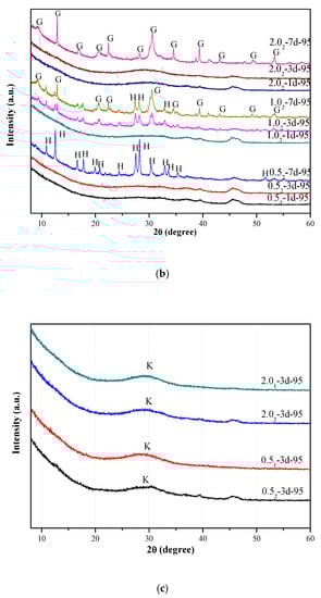 X-ray diffraction (XRD) patterns of K-A-S-H samples (a) synthesized at different reaction temperatures, (b) synthesized by reaction at 95 °C, and (c) synthesized using different SiO2/Al2O3 ratios at 95 °C. (K: K-A-S-H gels, G: K-G zeolite, H: Zeolite K-H).