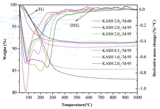 The TG/DTG curves of the K-A-S-H samples are shown in Figure 2. In general, each K-A-S-H powdery sample showed a mass loss below 150 °C. This mass loss value was related to changes in the amount of water adsorbed or evaporated [23] during synthesis. There was a large mass loss for sample K-A-S-H2.02-7d-60, suggesting high adsorbed water content due to incomplete reaction of the raw materials of the sample under the curing condition of 60 °C (the raw materials were highly hygroscopic [2]). Samples synthesized using three different K2O/SiO2 ratios were cured for 7 days at 95 °C, and the TG/DTG curves showed small mass loss peaks at 190 °C, 200 °C, and 250 °C, separately. Combined with the XRD results, the samples contained crystalline zeolite phases, indicating more tightly physically bound and/or loss of zeolite water [2,24]. These peaks were not present before 7 days of curing time, which indicates that rearrangement and structural ordering of the water-containing phases (e.g., zeolites) persisted from the 3rd day to the 7th day of curing time as the reaction progressed. Samples K-A-S-H2.01-3d-95 and K-A-S-H2.02-3d-95 also showed small mass loss peaks at around 200 °C in the TG/DTG curves, due to the loss of nonevaporable water [23,24], as defined by Thomas et al. [25,26]. This can be associated primarily with structural water and some constrained water in the gel.