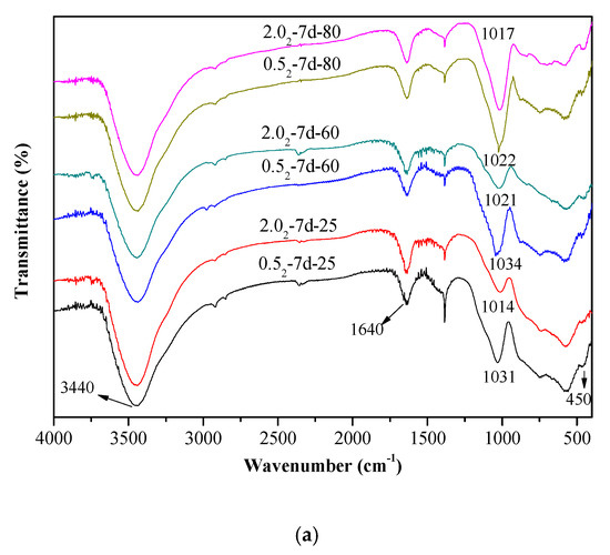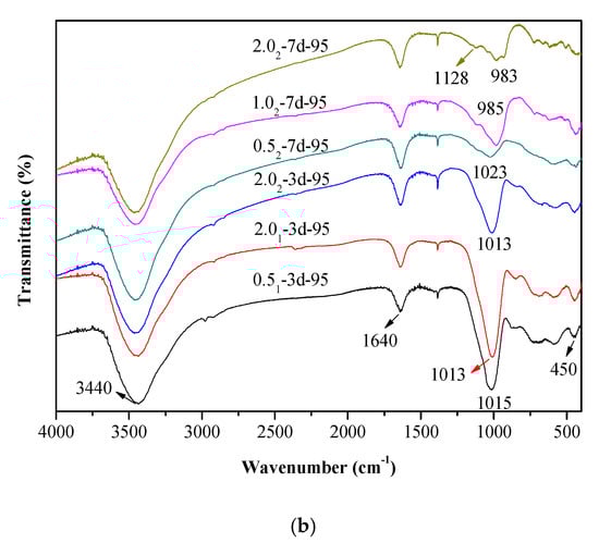The vibrational spectra of different K-A-S-H samples were determined and are shown in Figure 3. The characteristic bands at 3440 cm−1 and 1640 cm−1 are respectively caused by the stretching vibration and bending vibration of O–H in adsorbed water [29,30]. The formation of Si–O–T bonds (T = tetrahedral Si or Al) results in a strong stretching vibration signal at 1031 cm−1 [2], but this bond is located at about 950 cm−1 in the chain structure of C-(A)-S-H [31]. The K-A-S-H gels show quite different results. The main band (νas T–O: where T is Si or Al) moves from a low to high wavenumber position, which is more typical in a low calcium environment gel. The characteristic peak of the stretching vibrations of T–O–Si (T Si or Al) bonds is located at about 1031 cm−1 in the K-A-S-H sample at 25 °C, as shown in Figure 3a. With increased curing temperature, this band only slightly shifts to 1021 cm−1. When the curing temperature was increased to 95 °C (see Figure 3b), this characteristic peak showed a significant shift to 1013 cm−1. This shift was also seen with increased curing time, and this band in sample K-A-S-H2.02-7d-95 shifted to 983 cm−1. The shifts occur with increased silicon substitution by aluminum in the second coordination sphere due to the weaker Al–O bonds [14]. In addition, the main bands, corresponding to the T–O–Si (T Si or Al) stretching vibrations in the K-A-S-H samples, became somewhat rounder and broader in shape, particularly after curing at 95 °C for 7 days. The change of polarization of the oxygen atom on the Si–O–Al linkage, may cause an increase in the remaining Si–O bond strength in the previous pairing silicate tetrahedron. This may lead to a higher wavenumber contribution to the main Si–O band, thus broadening the band around 983 cm−1 [32]. Comparison of the position of the T–O–Si stretching vibration characteristic peak for different K2O/SiO2 ratios reveals band shifts. For materials at the same SiO2/Al2O3 ratio, as the K2O/SiO2 ratio increased, the band shifted to a low wavenumber. This indicated that an increase in K2O/SiO2 ratio causes a decrease in TO4 (T is Si or Al) tetrahedral polymerization. These observations are similar to the formation [2,23,28] of the N-A-S-H system product linkages. When K2O/SiO2 is increased, the amount of K+ in the reaction system exceeded the quantity required to balance the negative charges of AlO4− tetrahedra. To maintain electric neutrality, the number of non-bridging oxygen bonds with a negative charge in the structure increases. The non-bridging oxygen bonds are not shared by two or more polyhedrons, only connected with a net-forming ion, and the original structure of TO4 (T is Si or Al) becomes more isolated [2,33,34]. As a result, the band of Si–O–T stretching vibration moves to a lower wavenumber in the FT-IR spectrum. With increased curing time or temperature, the band appears at a lower wavenumber, indicating that excess K+ in the reaction system entered the aluminosilicate structure with an increased reaction degree.