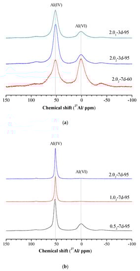 The 27Al MAS-NMR spectra of different samples were determined and are shown in Figure 4. For amorphous or semi-crystalline K-A-S-H products, obtained 27Al MAS-NMR spectra can be split into two asymmetric lines with line shapes that are typical of Al in an amorphous environment (Figure 4a,b). The chemical shifts at 52 ppm and 1 ppm are respectively related to Al in tetrahedral (noted as Al IV) and hexahedral environments [36,37].