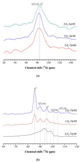 The 29Si MAS-NMR spectra of different samples are shown in Figure 5. The change of SiO2/Al2O3 ratio (with K2O/SiO2 ratio kept constant) has little effect on the morphology of the 29Si MAS-NMR spectra of the samples. When the curing temperature was increased by 95 °C, Q2 shifted to the negative direction, as shown in Figure 5a. As shown, there is only one main peak, with the first resonance at −83 ppm and the second at −86 ppm. These peaks have been attributed to Q2 (1Al) and Q2 (0Al) units, respectively, indicating that most silicate tetrahedra are chain mid-members and Al substitution for Si has occurred in the silicate chains [36,37].