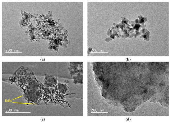 Figure 7a shows the TEM image of sample K-A-S-H2.02-7d-60, revealing mainly a loose flaky structure with aggregated strip particles and a porous and rough surface, surrounded by some spherical particles, which should be amorphous gels. Similar results were also reported by Pena et al. [42]. When the curing temperature was increased to 95 °C for sample K-A-S-H 2.02-3d-95, as shown in Figure 7b, the products showed mainly irregular spherical particles of about 50–100 nm. The particles overlapped each other to form a small piece, different from sample K-A-S-H2.02-7d-60. Considered with the results of XRD analysis, in most cases, a significant amount of amorphous K-A-S-H gels was detected. For the sample cured for 7 days, K-A-S-H 0.52-7d-95 (see Figure 7c), there were no crystal grains, and thin, crumpled foils were observed [24], with some fibrous structures of about 200 nm polymerized together with the foils. Additionally, a small amount of flaky structure indicated the presence of the crystalline phase in the samples. For the sample prepared at a K2O/SiO2 ratio of 2.0 at this curing temperature, as shown in Figure 7d, the layered sheet structure indicates the presence of another crystalline phase in the samples that is denser than that in the samples prepared at the low K2O/SiO2 ratio.