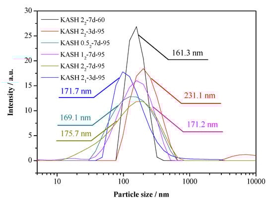 The particle size distribution for each group of K-A-S-H samples was relatively stable, with a range of particle diameter of 100–300 nm, and an average particle size of about 180 nm. The results of particle size distribution analysis agree well with the results of sample agglomerated particle size obtained by TEM observation. The XRD, SEM, and TEM analysis of sample K-A-S-H2.02-7d-60 revealed an amorphous product, with the narrowness of the particle size distribution range likely related to the increase in the homogeneity of the raw material that did not completely react.