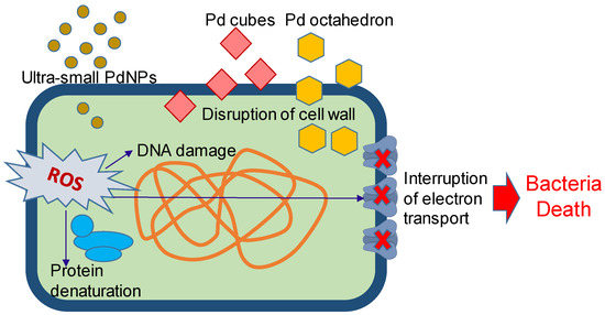 The antibacterial property of PdNPs was recently discovered and the reported data showed that PdNPs have a high potential for antimicrobial applications [31,33,46,47,78,79,80]. As illustrated in Figure 1, the antibacterial mechanism of PdNPs included both physical and chemical modes. The facet of a Pd nanocrystal is able to disrupt the membranes of microorganisms [34]. PdNPs are capable to generate the reactive oxygen species (ROS), which cause cell membrane damage, DNA damage, protein denaturation, and interruption of electron transport, resulting in the death of bacteria [34,79]. The experimental data proved that the anti-pathogenic activity of PdNPs is better than that of Pd2+ ions [33].