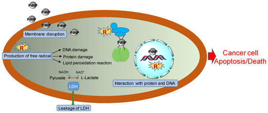 Besides the antibacterial property, PdNPs also have toxicity to the cancer cell line. As shown in Figure 2, the antitumor mechanism of PdNPs includes the physicochemical interactions of PdNPs with the functional groups of proteins, nitrogen bases, phosphate groups of DNA [82], the leakage of lactate dehydrogenase (LDH) [83], the generation of free radicals [84], and the disturbance of the cell cycle [85]. Proteins and DNA might transfer to inactive states by interaction with PdNPs. LDH plays an important role in the production of usable energy for cells. The LDH levels can be increased in many cancer cell types [86], and the leakage of LDH causes a serious problem to all functions of cancer cells. The generation of free radicals, which includes both the reactive oxygen species (ROS) and reactive nitrogen species (RNS), causes the DNA damage, protein damage, and lipid peroxidation reaction [87].