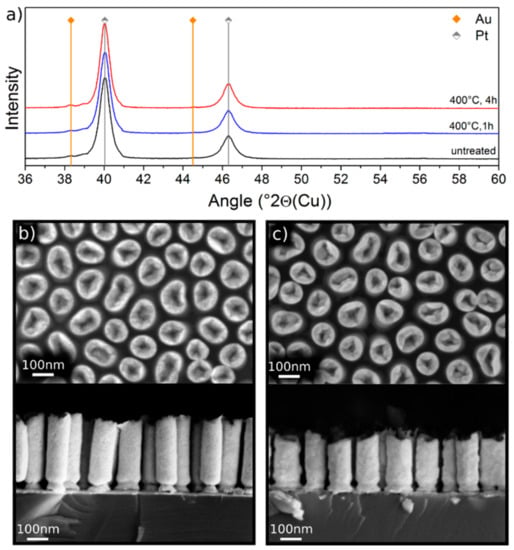 (a) XRD patterns of as-fabricated Pt nanorods (NRs) (black line), annealed at 400 °C for 1 h (blue line) and annealed at 400 °C for additional 3 h (red line). The peaks match the positions of the characteristic Pt peaks obtained from the reference sample (vertical grey lines). The 15 nm Au underlayer caused small peaks located at the characteristic 2θ positions of the Au peaks (vertical orange lines). (b) Top and side view backscattered electron (BSE) micrographs of Pt NRs before annealing, and (c) after annealing at 400 °C for 4 h. The NRs contracted after annealing and the Au underlayer was partially spheroidized.