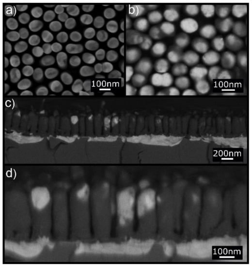 (a) Secondary electron (SE) SEM top view of the Au NRs before annealing. (b) BSE SEM top view of the Au NRs after annealing at 250 °C for 1 h. The high-resolution BSE image shows dark contrast in NRs with bright top caps. (c,d) BSE cross-section images at two different magnifications showing the NR structure after annealing. The same contrast characterizes the NRs and the silicon substrate. Some of the NRs are partially covered laterally with Au film. Notice also the presence of a thick Au layer (bright contrast) beneath the dark Si NRs.