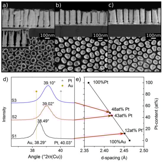 All Si wafers were cleaned and stripped of the native oxide layers by immersion in sulfuric acid 96% for 1 h and nitric acid ≥ 65% for 2 h, both in an ultrasonic bath, followed by rinsing in 1% hydrofluoric acid (HF), before use. The NR arrays were prepared using substrate-supported AAO thin film templates, whose preparation was described in detail in previous works [22,23,24,25,26]. Briefly, 100 Si wafers were first coated with a thin titanium adhesion layer (6 nm) followed by a gold underlayer (15 nm) via sputtering. On top of this heterostructure a 500 nm aluminum layer was electron beam evaporated. Anodization was conducted under potentiostatic conditions using oxalic acid with a concentration of 0.2 M at 70 V anodization using a potentiostat (Keithley 2400 SM, Cleveland, OH, USA). Following the anodization, the oxide barrier layer was removed using 5 wt.% phosphoric acid at a temperature of 30 °C. Au, Pt, and AuPt alloys were deposited into the pores via electrochemical deposition from an aqueous solution of 8 mM HAuCl4·3H2O, 10 mM H2PtCl6, and mixtures of both with different mixing ratios. An electrochemical workstation (Princeton Potentiostat/Galvanostat Model 263A, AMETEK, Berwyn, PA, USA) was used for the deposition. Reference samples of Au and Pt NRs were fabricated as described above using 8mM HAuCl4·3H2O and 10 mM H2PtCl6, respectively. For comparison, thin films of Pt and AuPt alloys were processed by electrochemical deposition of 10 mM H2PtCl6 and different mixtures of 8 mM HAuCl4·3H2O and 10 mM H2PtCl6, respectively. The heat treatment was done in a tube furnace (Linn High Therm FRH, Bad Frankenhausen, Germany) at 400 °C. Electrodeposited Pt films were heated at temperatures up to 800 °C for times ranging from 1 to 2 h. A mixture of 10 mL deionized water, 5 mL ethanol, and 0.25 mL ammonium hydrogen difluoride was used for dissolving Si. The samples were characterized via scanning electron microscopy (SEM, Zeiss Ultra, Oberkochen, Germany), energy dispersive X-ray spectroscopy (EDX, INCA, Oxford, Oxford Instruments, Abingdon, UK), X-ray diffraction (XRD, X’Pert Pro diffractometer, PANalytical,, Kassel, Germany) in grazing incidence mode with a grazing angle of 2°, helium ion microscopy (HIM, Zeiss Orion NanoFab, Zeiss, Oberkochen, Germany), and transmission electron microscopy (JEOL 2100f at 200 kV, Akishima, Japan). Samples for TEM were prepared by focused ion beam sectioning.