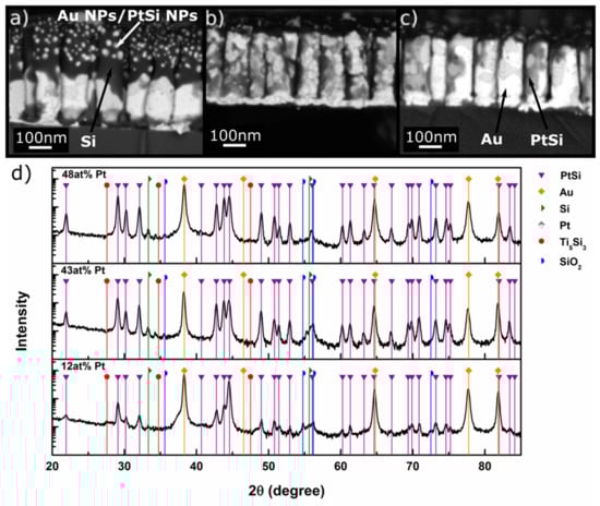 The XRD patterns of the samples after annealing for 3 h at 400 °C shown in Figure 4d reveal the formation of new phases. Prominent among them is the rhombohedral intermetallic PtSi phase. It should be noted that Pt seems to have been fully consumed from the alloy to form PtSi since the 111 AuPt alloy peaks in Figure 3d shifted to the 2θ position of elemental Au. This confirms that the nanoalloy phase was no more present. As a corollary, the PtSi peak intensity increased with increase in the initial content of Pt in the AuPt NRs, signifying higher mass fractions of PtSi phase. There were also very weak peaks that could possibly be attributed to Ti5Si3, SiO2, and Si, although we cannot be conclusive about their formation.
