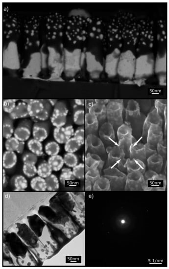 Electron microscopy images of Sample S1. (a) SEM BSE of the cross-section. (b) Top view SEM BSE micrograph showing the NRs tips displaying crowns of embedded NPs. (c) Helium ion microscope (HIM) SE image showing the hollow tip morphology of the NRs after annealing. The NR in the middle (arrows) is (on purpose) nanomachined at a specific angle to reveal that Au NPs are embedded in the Si matrix. (d) STEM image of a NR lamella showing the Au NPs embedded in the amorphous Si matrix (see the selected area diffraction pattern (e)). The film at the top of the NRs is the tungsten film that serves as a support for the lamella during focused ion beam (FIB) machining.