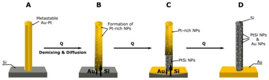 A schematic summary of the proposed mechanism for both Au and AuPt NRs is given in Figure 7. When pure Pt NRs were on Si substrate, such accelerated diffusion of Si to the NR tip did not occur possibly because Pt did not weaken the SiSi bonds as in the case of Au. Therefore, any reaction was confined to the interface, as with most other interface reactions. This would be a very slow process and, hence, was not detected at most temperatures except at high temperatures in our experiments.