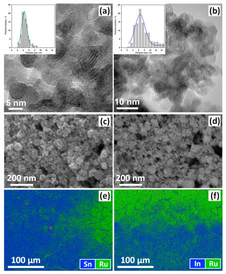 High resolution transmission electron microscopy (HRTEM) (a,b) images of SnO2 (a) and In2O3 (b) nanoparticles. SEM (c,d) images of SnO2 (c) and In2O3 (d) thick films deposited over functional substrates and sintered at 300 °C. Energy dispersive X-ray spectroscopy (EDX) maps (e,f) of element distribution on the surface of the hybrid SnO2+RuITP (e) and In2O3+RuITP (f) thick films.