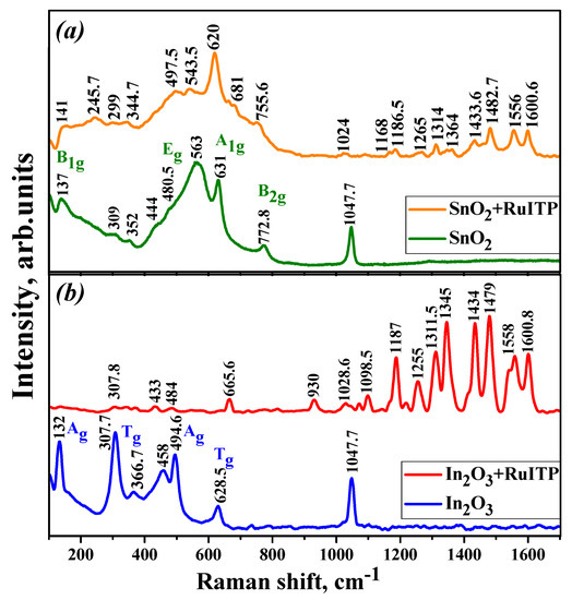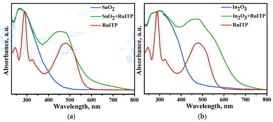 In the Raman spectra of hybrid materials (Figure 2), serial bands in the high-frequency region due to the Ru (II) heterocyclic complex were observed. The low-frequency region also consists of the contribution from SnO2 and In2O3 nanoparticles. The band at 1047.7 cm−1 in pure SnO2 and In2O3 probably attributed to longitudinal optical (LO) phonon vibrations. The wavelength of the laser used as the radiation source (514 nm) coincides with the wide shoulder of the In2O3+RuITP sample (Figure 5). This can lead to the resonance of the molecules in the excited state. Therefore, the bands associated with Ru (II) heterocyclic complex for In2O3+RuITP are more intense than for SnO2+RuITP.