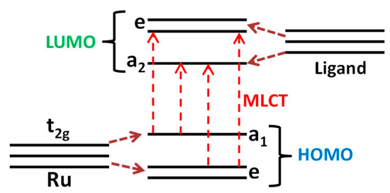 As a result of overlapping ruthenium d-orbitals with π*—anti-bonding ligand orbitals, the highest occupied molecular orbitals (HOMO) and the lowest unoccupied molecular orbitals (LUMO) are formed, as shown in Figure 3. As a result of the large energy difference between the occupied Ru d-orbitals and the unoccupied ligand orbitals, the HOMO is mainly localized at the metal and the LUMO belongs to the ligand anti-bonding orbitals. Therefore, the excitation and transition of an electron from the HOMO to the LUMO is called metal-to-ligand charge transfer (MLCT) and leads to the appearance of a photoabsorption band in the wavelength range between 380 and 520 nm [33,51]. MLCT transition corresponds to the visible spectral range; therefore, it is the most important characteristic of the complex molecule that can be used as a photosensitizer.