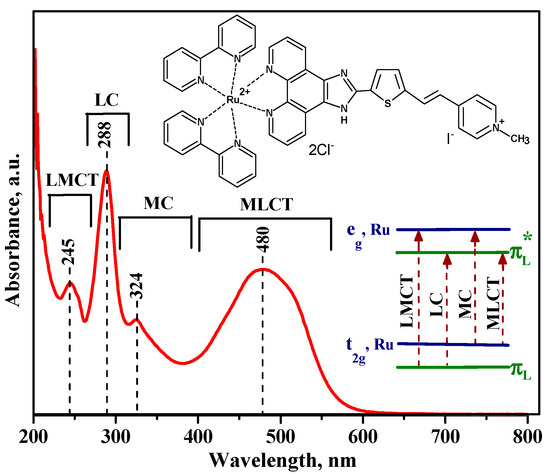 The optical absorption spectrum of Ru (II) heterocyclic complex is presented in Figure 4. The electronic transitions in this compound are observed both in the visible and in the near UV region. In addition to the MLCT transition, other important electronic transitions are summarized in the inset of Figure 4. The wide absorption band at 480 nm can be the result of overlapping of π → π* charge transfer in 1H-imidazo-phenantroline ligand and two MLCT processes: (t2g, Ru → π* substituted 1H-imidazo-phenantroline (ImPh) ligand) and (t2g, Ru → π* bpy ligand) transitions. In the UV range, high-energy transitions dominate in the process of intraligand π → π* charge transfer in bipyridine ligands (LC-ligand-centered) and ligand-to-metal charge transfer (LMCT) (πL → eg, Ru). The weak absorption band at 324 nm can be attributed to the transition between the metal orbitals (MC-metal-centered) (t2g, Ru → eg, Ru) [33,52,53].